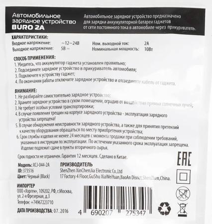 Автомобильное зарядное устройство Buro XCJ-044-2A 2А черный