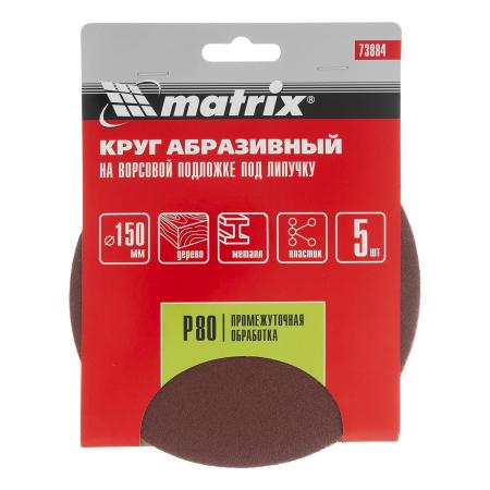 Круг абразивный на ворсовой подложке под "липучку", P 80, 150 мм, 5 шт.// Matrix