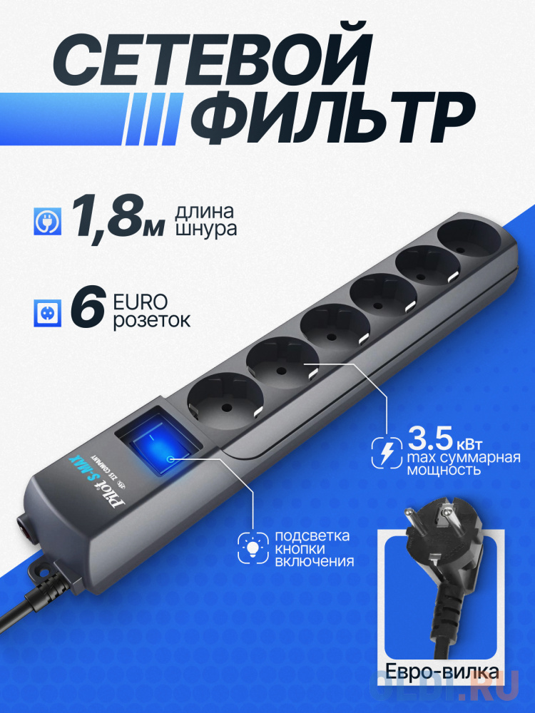 Сетевой фильтр Pilot S Max 6 розеток 1.8 м