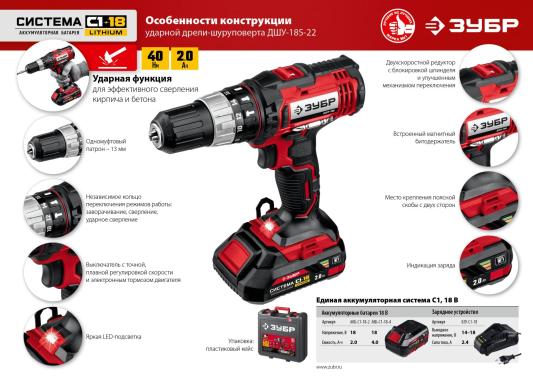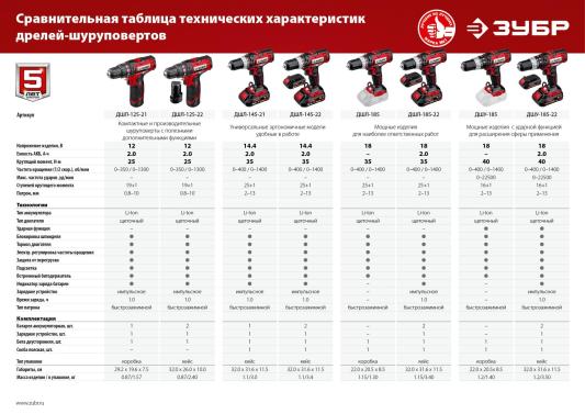 Дрель-шуруповерт Зубр ДШУ-185-22 аккум. патрон:быстрозажимной (кейс в комплекте)