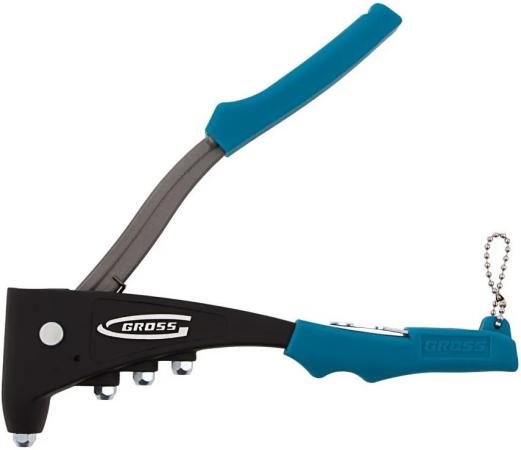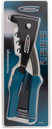 Прочие особенности и свойстваЛитой усиленный заклепочник Gross 40403 для заклепок диаметром 2,4-4,8 мм применяется для надежного соединения плоских заготовок и деталей. Для этого используются стальные и алюминиевые заклепки или заклепки из нержавеющей стали. Для установки крепежа не требуется особых усилий благодаря кованому изогнутому рычагу. Инструмент используется в строительстве, при производстве мебели и техники, для соединения листового металла и т.д.