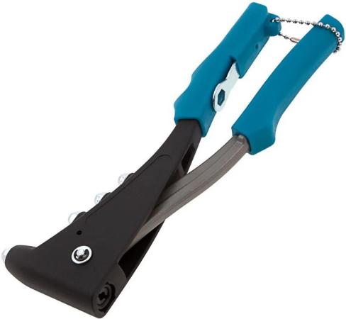 Заклепочник изготовлен в Тайване, имеет литой корпус и штампованный рычаг из стали, характеризуется высоким качеством и надежностью.
