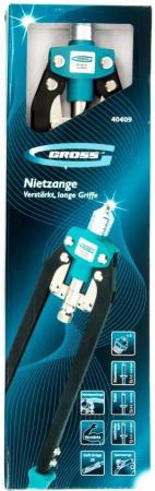 Прочие особенности и свойстваДвуручный усиленный заклепочник Gross 40409 длиной 520 мм, с удлиненными рукоятками, предназначен для соединения листовых заготовок, металлопрофиля, легких строительных конструкций и плоских деталей при помощи алюминиевых или стальных (в том числе из нержавеющей стали) заклепок размером 3,2-4,0-4,8-6,0-6,4 мм, для которых предусмотрены сменные насадки соответствующих размеров. Благодаря удлиненным рукояткам процесс клепки требует меньше усилий, чем при применении обычного инструмента. Заклепочник используется при проведении строительных и ремонтных работ, в производстве мебели, бытовой и оргтехники, а также при ремонте автомобилей.