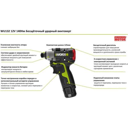 WORX Professional Impact Винтоверт аккумуляторный, ударный, бесщеточный WU132,12В,140Нм, 2x2Ач WU132