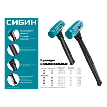 СИБИН 3 кг, 360 мм, цельностальная кувалда с удлинённой обрезиненной рукояткой (20132-3)