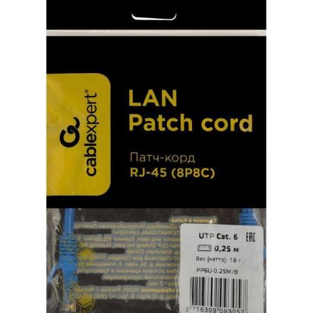 Патч-корд PREMIER PP6U-0.25M/B литой (molded), UTP, cat.6, 0.25м, 4 пары, 24AWG, алюминий омедненный, синий
