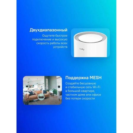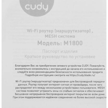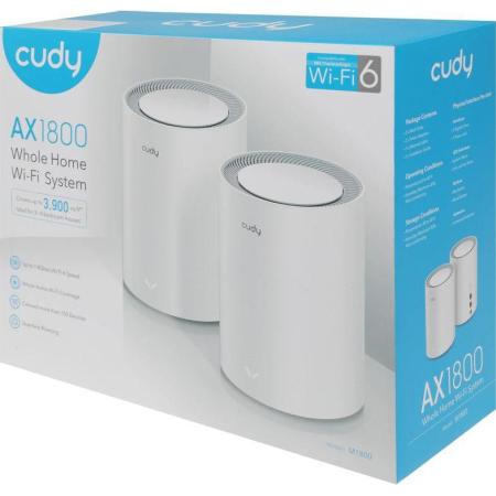 Wi-Fi Mesh-система/ AX1800 Wi-Fi 6 Mesh Solution 2-Pack,Chipset MediaTek, Dual-Band, 802.11ax/ac/a/b/g/n, 1201Mbps at 5GHz + 574Mbps at 2.4GHz, 2 Gigabit Ethernet Ports, 4 internal antennas, MU-MIMO, DDNS, Zerotier/Wireguard/OpenVPN/IPSec/L2TP/PPTP VPN, DNS over Cloudflare/Google/Quad9, IPv6, Seamless Roaming, WPA3, TR069/TR098/TR111/TR181, Cudy Mesh, Cudy APP