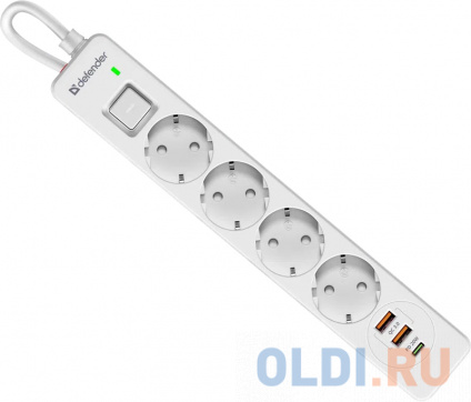 Defender Удлинитель с сетевым фильтром DFS 143, белый, 4розетки, USB+TypeC, 3 м.