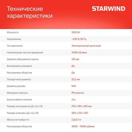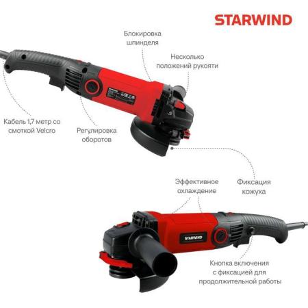 Углошлифовальная машина Starwind AG125LE-1500 1500Вт 11000об/мин рез.шпин.:M14 d=125мм