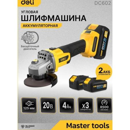 DELI Угловая шлифмашина аккумуляторная 125мм DC602 (2 акб, 20В х 4Ач, ЗУ, 3 скорости, сумка) 162787