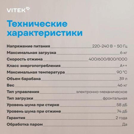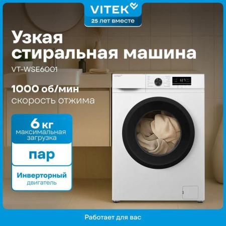 Стиральная машина узкая Vitek VT-WSE6001, с фронтальной загрузкой, 6кг, 1000об/мин, с паром, инверторная