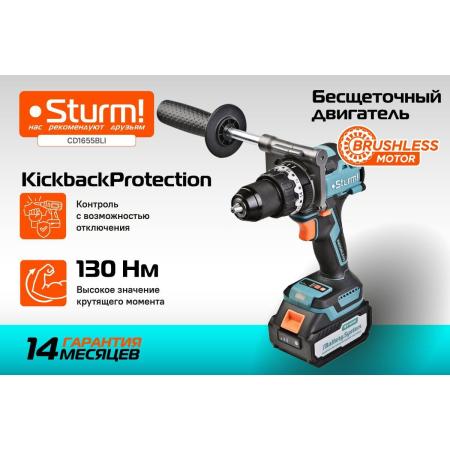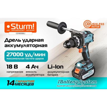 Sturm Дрель аккумуляторная ударн., б/щ 18В, 1BatterySystem, 130Нм, 1x4.0Ач, кейс CD1655BLI